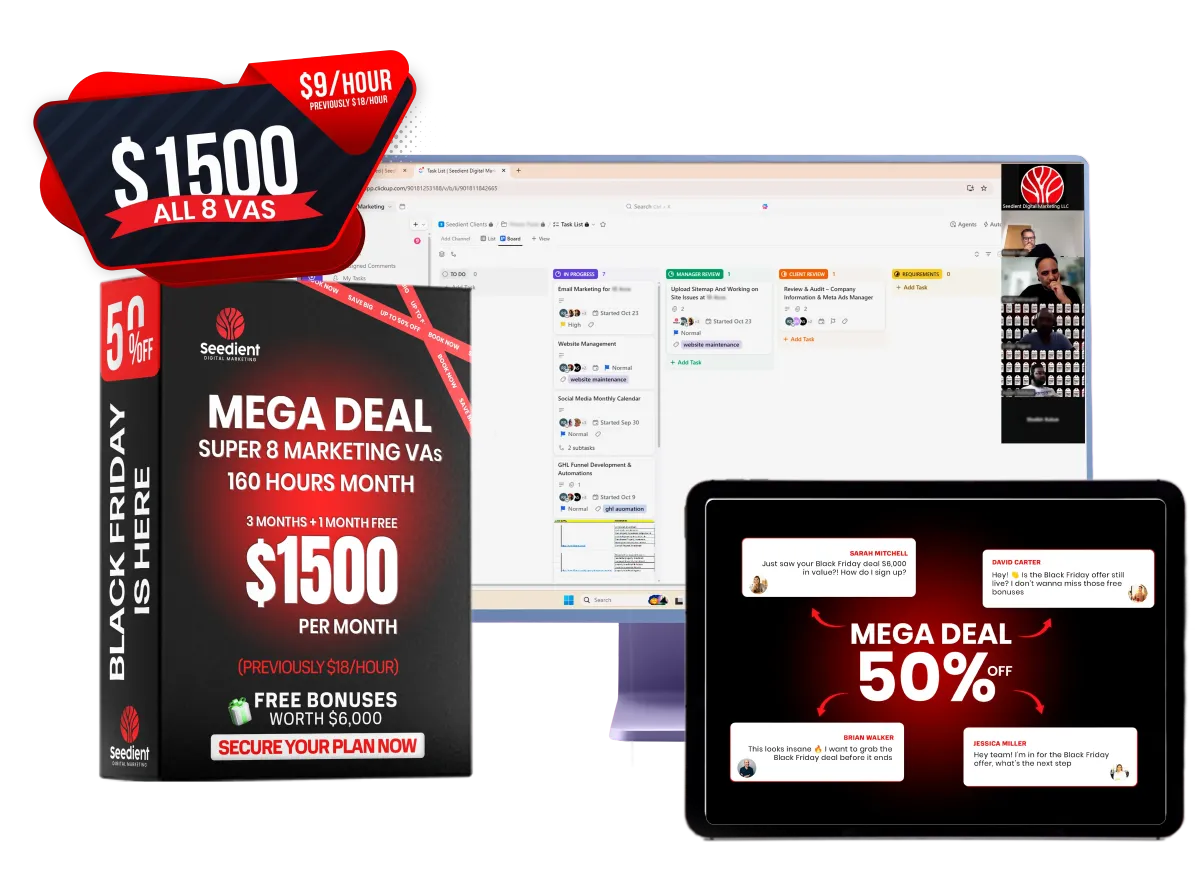 You’re getting a full AI-Powered digital marketing team 8 skilled VAs (Ads, SEO, Social Media, Web Dev, Automations, Design, and Video Editing) working 160 hours per month for your business. Everything you need to scale, at 50% OFF.